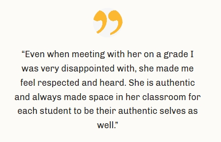 I cultivate a holistic, inclusive learning environment, focused on dialogic learning, allowing students to kindle their interests within the context of the subject matter. I consciously tailor teaching and assessment strategies to nurture the diverse intelligences of each student, utilizing lecture, interactive activities, small group work, discussion, writing prompts, and play. I teach with enthusiasm, believing that my love of learning translates into student engagement and I treat students as co-learners.